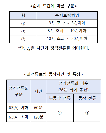 다음은 주택용 배선차단기의 순시트립에 따른 구분과 과전류 트립 동작 및 특성표이다. 표의 빈 칸을 채우시오.