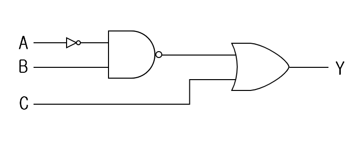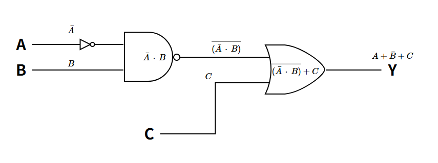 1) 간략화 과정 : $ \space\overline{\overline{A}\cdot B} + C = \overline{\overline{A}} \overline{\cdot} \overline{B} + C = A + \overline{B} + C$